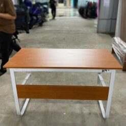 Mặt bàn màu nâu gỗ ấm áp kết hợp với khung chân sắt trắng sơn tĩnh điện, tạo nên vẻ đẹp hài hòa và phong cách hiện đại. Bàn cũng được thiết kế dễ dàng vệ sinh, giữ cho không gian làm việc luôn gọn gàng và sạch sẽ. Đây là một giải pháp tuyệt vời giúp tối ưu hóa không gian làm việc mà vẫn đảm bảo tính thẩm mỹ cao.