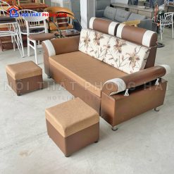 - Chất liệu: Sofa được bọc vải kết hợp simili, bàn chân inox mặt kính.