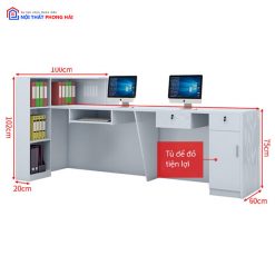 - Mô tả: bàn được làm từ chất liệu gỗ công nghiệp cao cấp. Bên trên có phủ 1 lớp melamine chống trầy, chống xước, chống bám bẩn giúp quầy luôn sáng bóng đẹp như mới. Mặt trong quầy thiết kế các kệ và tủ giúp để hồ sơ rất tiện lợi. Mặt bàn phẳng và rộng 2 người ngồi làm việc thoải mái.