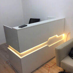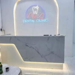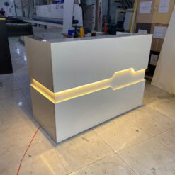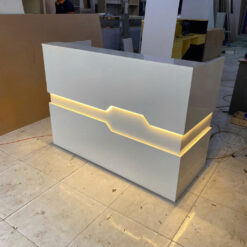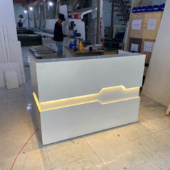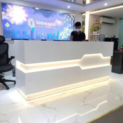 Đèn LED âm chạy ngang mặt trước quầy là chi tiết nổi bật tạo nên sự khác biệt. Ánh sáng vàng nhẹ giúp không gian thêm phần ấm áp, tăng sự chuyên nghiệp và tinh tế cho tổng thể khu vực tiếp khách. Đây cũng là yếu tố giúp sản phẩm nổi bật hơn trong các không gian ánh sáng trung tính hoặc thiếu sáng.